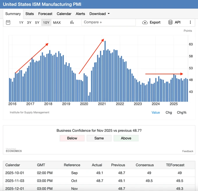 ➡️ “De huidige Amerikaanse business cycle flatlined nog steeds, maar wanneer deze begint uit te breiden (lees: readings boven de 50), zal de Bitcoin blow-off top zich beginnen te vormen. Geduld…”