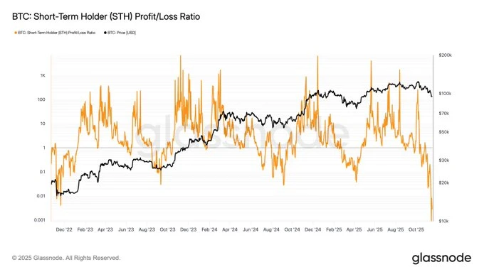 ➡️ De STH Profit/Loss Ratio is ingestort tot niveaus die voor het laatst werden gezien tijdens de FTX-capitulatie eind 2022, het dieptepunt van de laatste bear market…