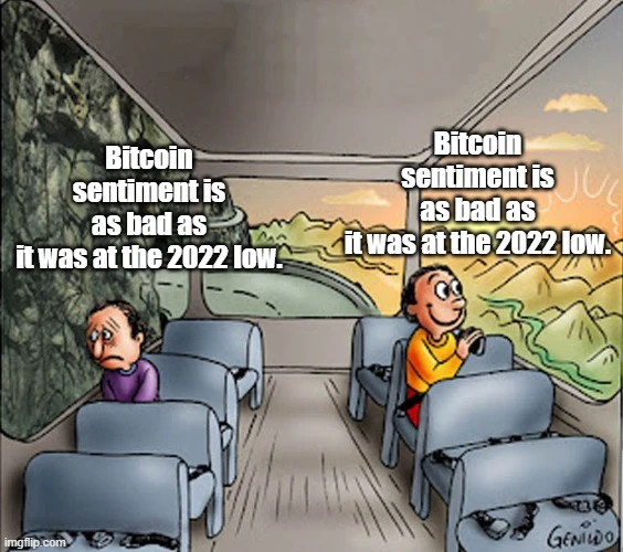 ➡️ De S&P 500 heeft de year-to-date prestatie van Bitcoin meer dan verdubbeld — de Nasdaq heeft deze meer dan verdrievoudigd. Pijnlijk. Maar hey, bekijk het van de positieve kant. Bitcoin staat nog steeds rond de $100.000, en het sentiment voelt om een of andere reden slechter dan de bodem van 2022.