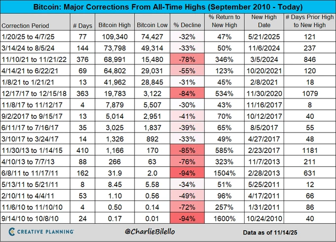 ➡️ Charlie Bilello: Bij $94.500 is Bitcoin nu 25% gedaald vanaf zijn all-time high van $126.000 op 6 oktober. Is dat een grote daling voor Bitcoin? Nee…