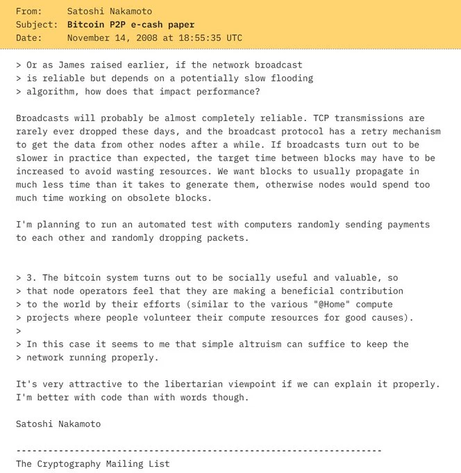 ➡️ Satoshi Nakamoto Emails 14 november 2008: “Het is erg aantrekkelijk voor het libertarische standpunt als we het goed kunnen uitleggen. Ik ben beter met code dan met woorden, trouwens.”