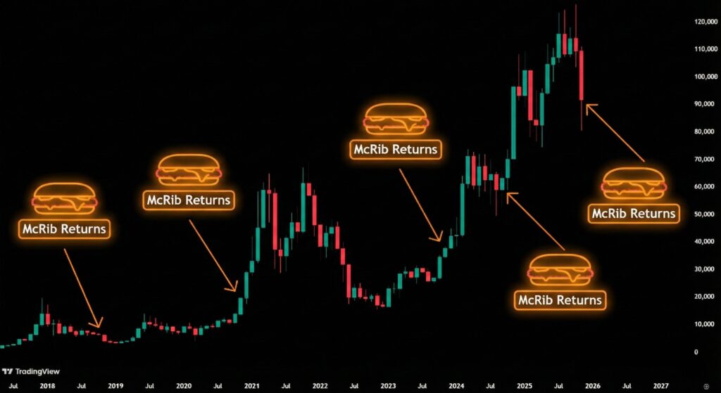 ➡️Bitcoin Archive: McDonald’s McRib signaleert EEN GROTE Bitcoin-rally. Elke comeback leidde tot explosieve BTC-prijsactie: