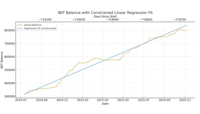 “Alleen IBIT koopt 1.200 BTC / dag (gemiddeld over de hele dag). Alle ETF’s + MSTR 2.000 BTC / dag = 1 miljoen+ BTC elke 2 jaar. (R2 = 93%). Het grootste deel van de vrij verhandelbare supply zal in het komende decennium worden opgekocht.” – Fred Krueger