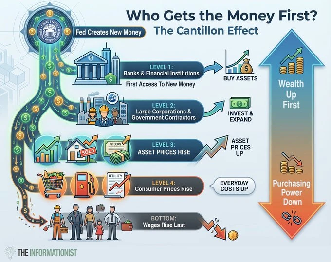 ‘De meeste mensen hebben nog nooit gehoord van het Cantillon-effect. Maar zodra je het begrijpt, ga je de wereld van beleggen anders zien. Wat is het? In het begin van de 1700’s zag Richard Cantillon een simpel patroon: wanneer nieuw geld een economie binnenkomt, bereikt het niet iedereen tegelijk. En wie het als eerste krijgt, profiteert het meest. Zo werkt het vandaag: nieuwe liquiditeit komt binnen via de Fed en via bankleningen. Beide volgen een vergelijkbaar patroon: