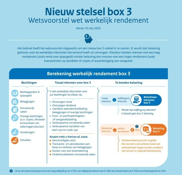 De hervorming, bekend als Wet werkelijk rendement Box 3, staat gepland voor 2028 en belast werkelijke rendementen door het verschil te meten tussen de waarde van een asset aan het begin en aan het eind van het jaar, plus eventuele ontvangen inkomsten. Dat betekent dat zowel gerealiseerde als ongerealiseerde winsten worden belast. Critici waarschuwen dat deze verschuiving ernstige liquiditeitsproblemen kan veroorzaken, waardoor beleggers belasting moeten betalen over papieren winst zonder te hebben gecasht.
