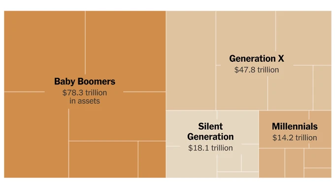 ➡️Boomers bezitten $78 biljoen aan assets. Millennials hebben $14 biljoen. De vermogensoverdracht komt eraan. En de volgende generatie is een wind in de rug voor Bitcoin.