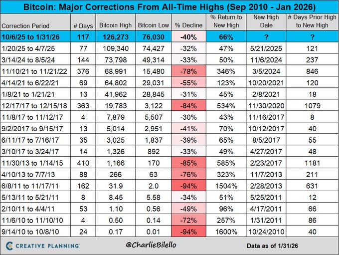 ➡️ Bitcoin staat nu 40% onder zijn piek van oktober 2022, de grootste drawdown sinds 2022. – Charlie Bilello