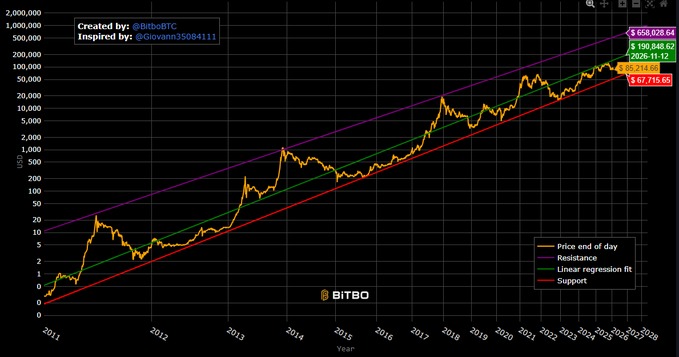 ➡️ Het power law-model suggereert dat de Bitcoin-prijs eind 2026 rond de $200.000 kan liggen. – Joe Burnett